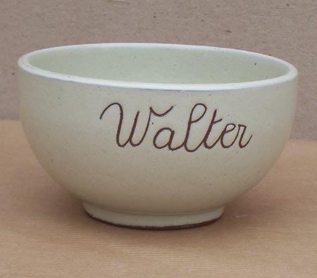 Nous fabriquons des bols personnalisés, dans notre atelier de Noron la poterie. Ils sont en grès émaillé, pour faire apparaître le prénom, nous gravons l’émail blanc et la terre de couleur sombre fait ressortir le trait.