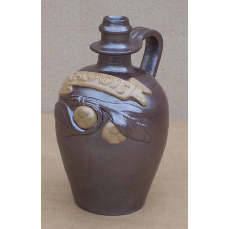 Bouteille traditionnelle pour conserver et servir le calva. En grès de Noron au sel et décoré d’un motif en relief représentant des pommes et des feuilles de pommiers et une bande en terre blanche avec l’inscription : CALVADOS.