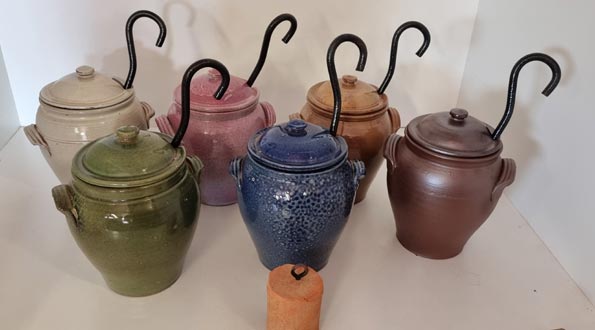 Chaque ensemble allume feu est constitué d’un pot en grès émaillé à l’intérieur avec son couvercle, d’une tige en métal et d’une pierre allume feu.