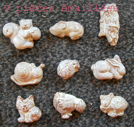 Collection de 9 fèves en grès émaillé : L’écureuil, la souris, le papillon, l’escargot, la coccinelle, le lapin, le chat le poussin et le mouton.