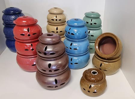 Ensemble de trois pots superposés pour conserver l’oignon, l’ail et l’échalote. Chaque pot est muni de trou pour favoriser l’aération.